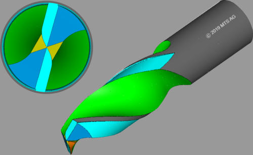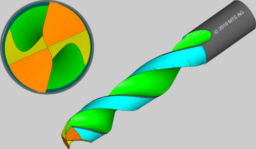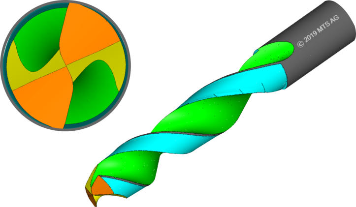 •Sonderanschliff mit 4 Zähnen/Nuten: Die 4 Hauptschneiden bestehen jeweils aus 4-Flächen-Anschliffen mit 4-Flächen-Eckenfasen. Die Hauptgruppe verfügt dabei über einem klassischen 4-Flächenanschliff, während die Nebengruppe verkürzte Zähne aufweist (analog zu einem 4-schneidigem Fräser mit 2-zum-Zentrum-Stirngeometrie).Forstner-Bohrer.•Der 2-stufige Giga-Drill besteht aus einerklassischen Mehrfasenbohrer-Geometrie.•Werkzeug: 6040017 „GIGA-Drill“